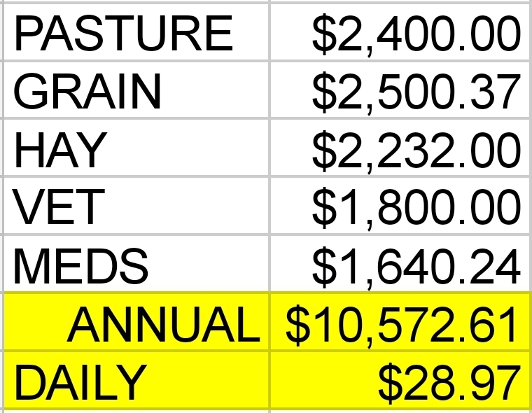 Ava & Dad require a low NSC grain which makes it a little more pricey than a normal bag of grain. The method used to create this grain makes it very easy to chew which is important for Dad & the low NSC is important for Ava as she has PPID (cushings). This grain costs $120/month at the recommended feeding rate Ava & Dad eat about 6 bags a month (each bag is 17.50 + tax). Ava also requires Prascend (Peroglide) which is $150 + tax & shipping every 60 days, we also added Equicoxx which is $105 every 60 days. Both Ava & Dad are on MSM which is another 16.99 + Tax once a month.