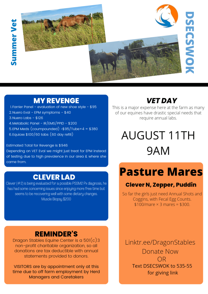 Last year most horse owners probably spent 4 to 5 thousand per a horse now you might get lucky to keep it under 10 thousand. We carry an insurance by ASPCA that covers major medical for our horses that has went up almost 20 a horse due to increase in vendor costs being passed on by Vets to the company that provides the coverage.
