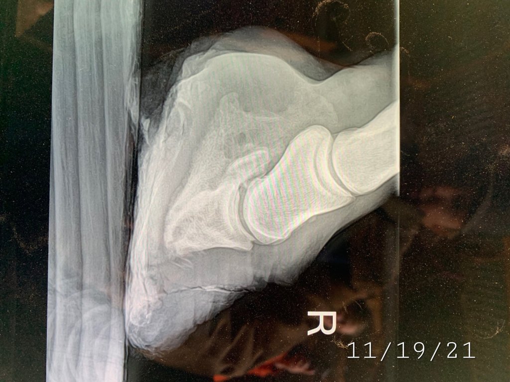 Revenge has Bi-Lateral Laminitis with Pedal Osteitis (demineralization of the coffin bone) she was also diagnosed with EPM, in treating the EPM she has started gaining growth weight quite rapidly and it’s putting an insane amount of pressure on her laminae (the glue that holds her foot together). This is causing her to sink further her sole is suppose to be about 15mm thick on her Right front it is maybe 2mm