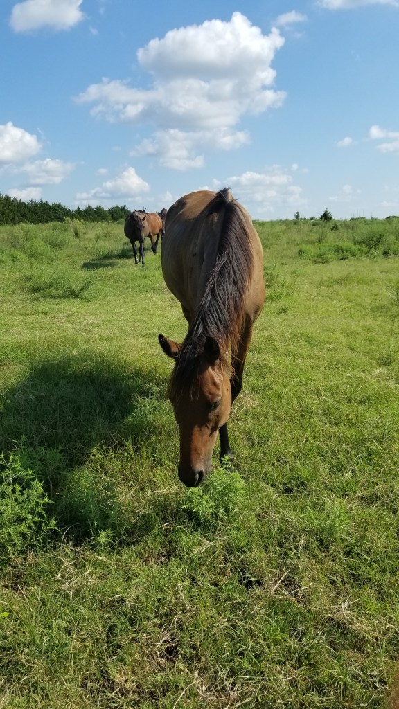Poseidon liked the back of the pack (hence his nickname of Turtle), he had been briefly retrained and was being used as a track pony with younger two year old racehorses before his rehoming attempt that went bad.